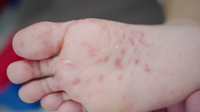As lesões típicas da doença mão pé boca surgem principalmente nas palmas das mãos, nas plantas dos pés e, às vezes, nas nádegas e pernas.